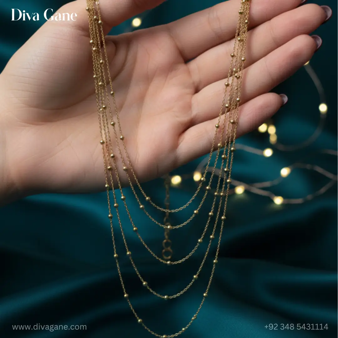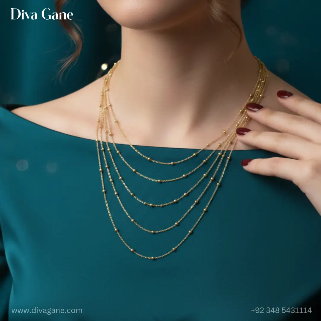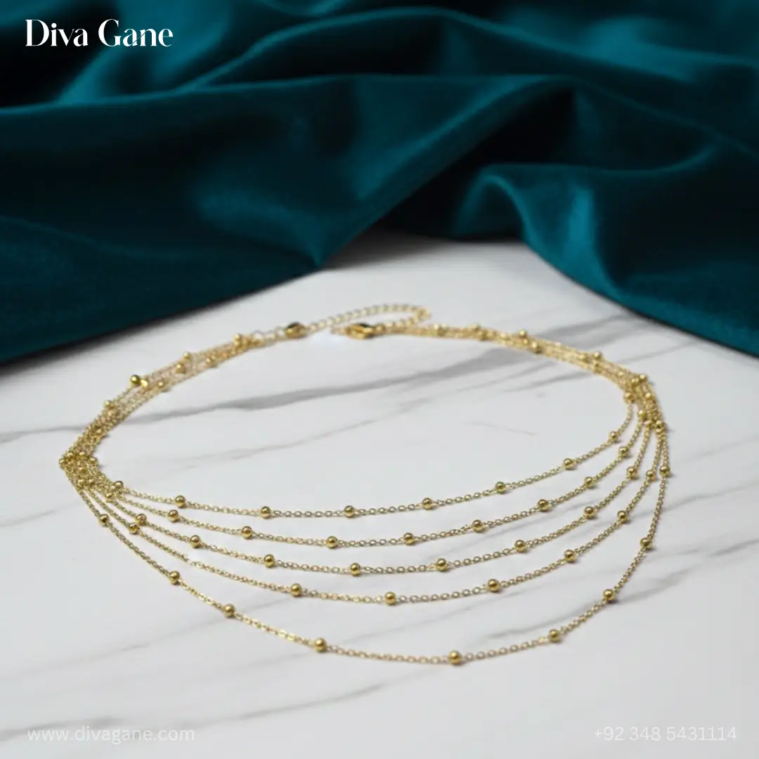 Master the art of the perfect stack without the hassle of tangled chains. Our Aurora Five String Gold Dainty Bead Layered Necklace features five expertly spaced layers of shimmering gold chains, each accented with delicate, high-polish “satellite” beads. This piece creates a stunning “waterfall” effect that beautifully frames the neckline.
