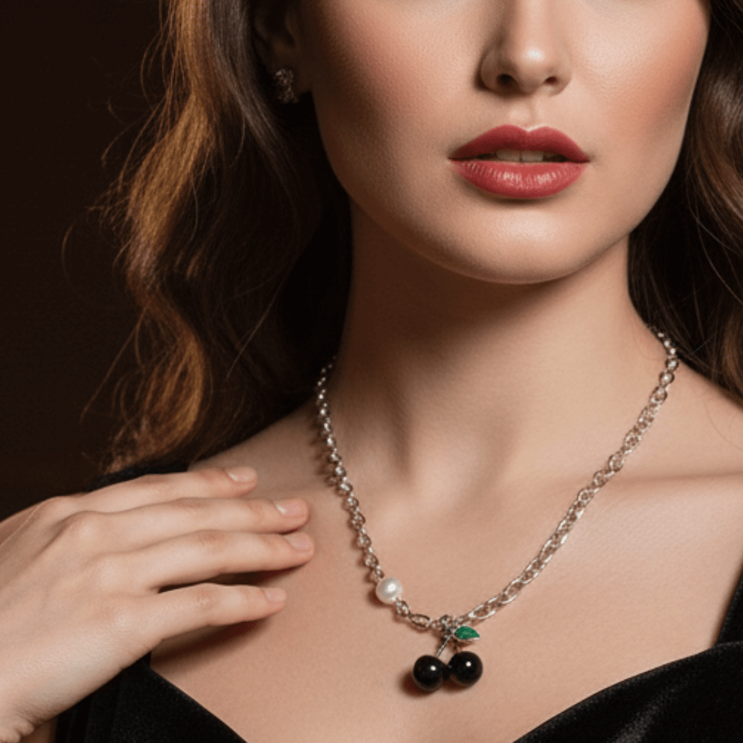A captivating black cherry pendant paired with a sleek silver chain, adorned with a lustrous white pearl. This elegant combination exudes timeless charm and sophistication, making it perfect for formal events or everyday wear. Crafted with precision, this piece is a harmonious blend of bold hues and delicate accents, adding a refined touch to your collection.