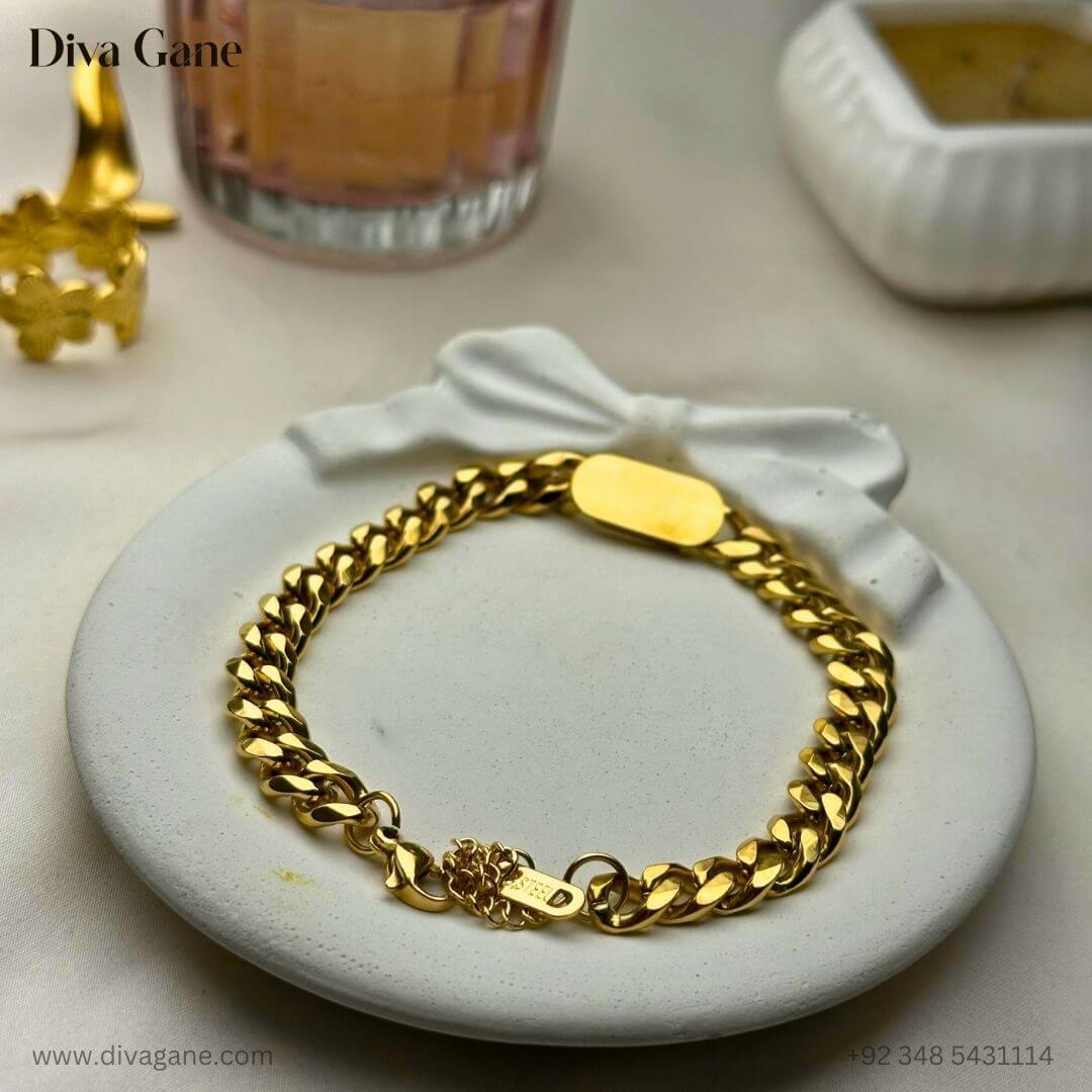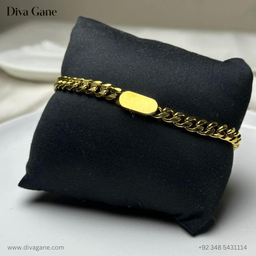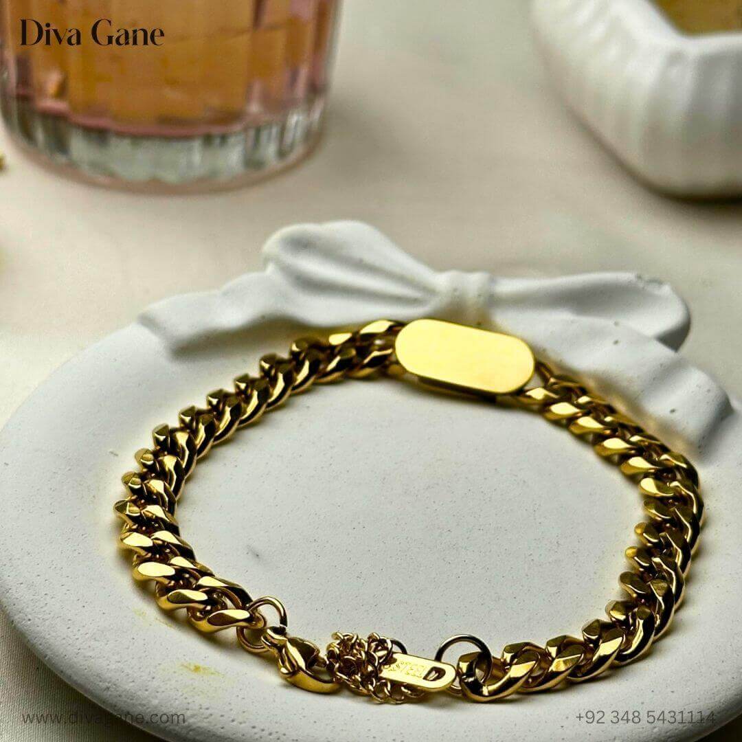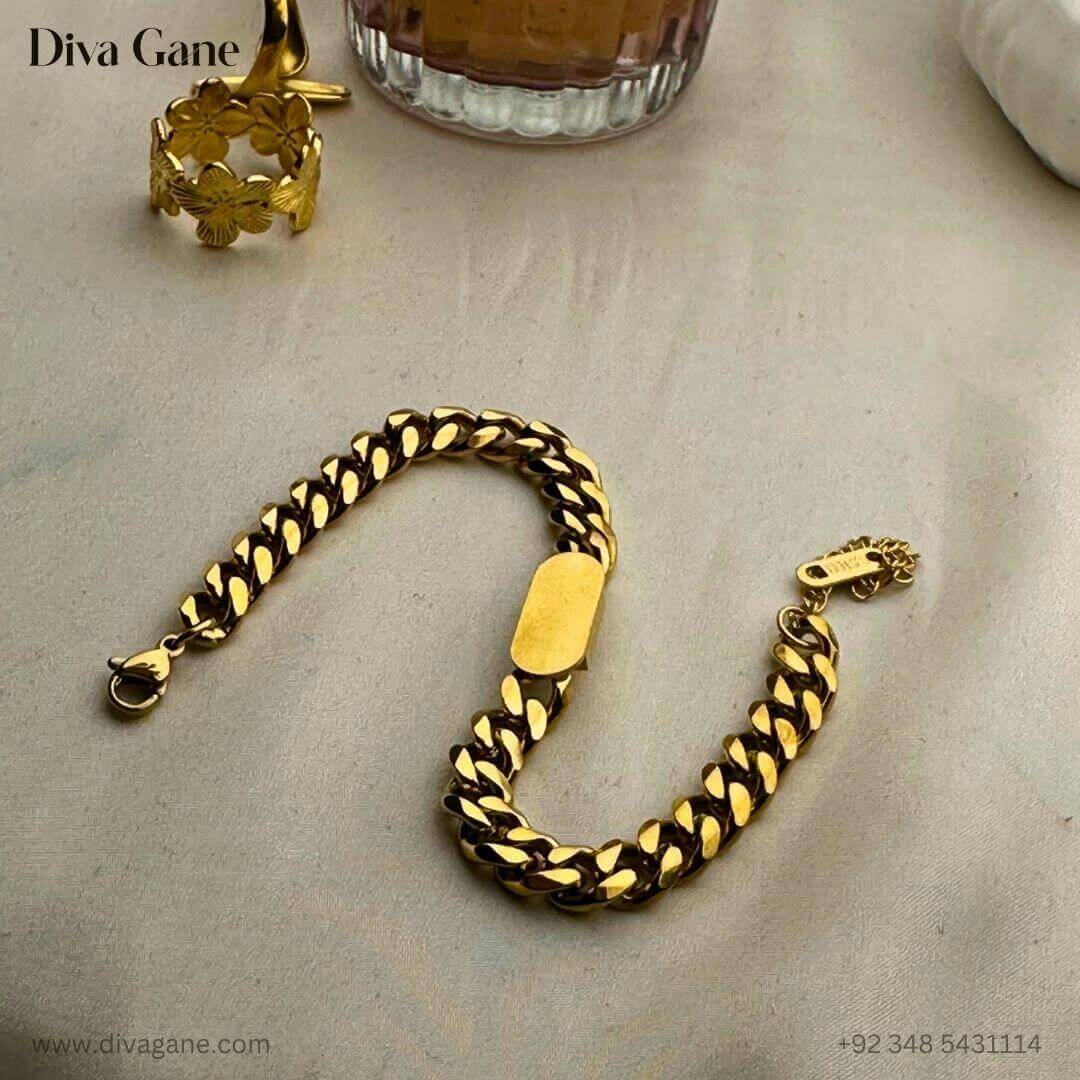 Simplicity meets shine in the Gold Glint Bracelet by Diva Gane — a delicate gold chain bracelet featuring a sleek golden block centerpiece. Designed for those who love effortless elegance, this bracelet adds a subtle yet radiant touch to your everyday or evening look.