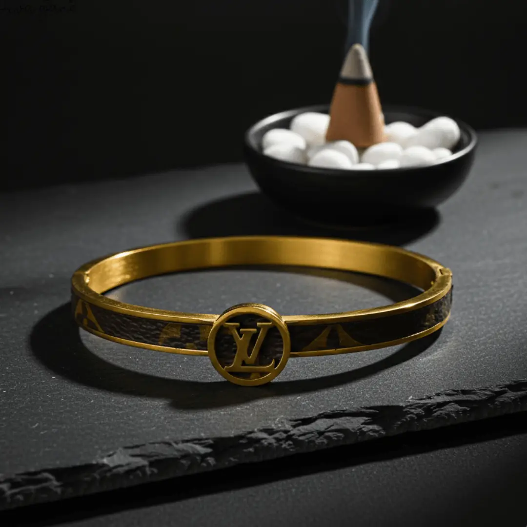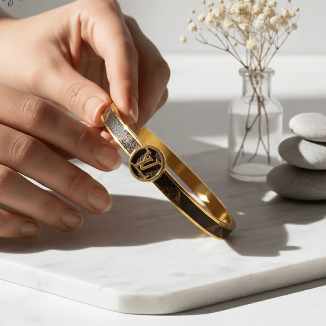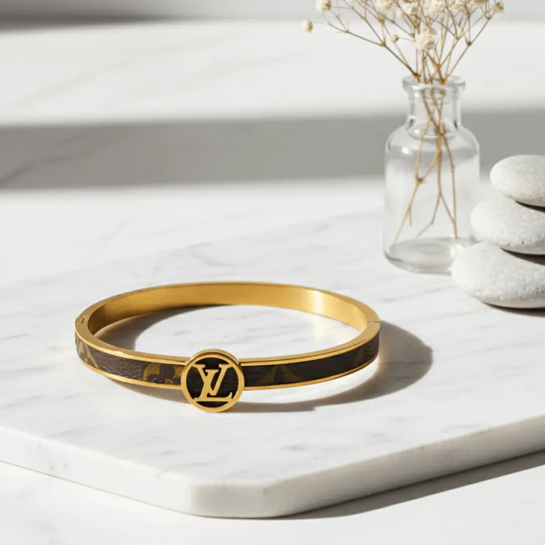 The signature monogram adds an unmistakable touch of sophistication, while the rich leather texture provides a comfortable, stylish wear. Whether worn alone or stacked with other accessories, the Leather Gold Bracelet effortlessly elevates any outfit, making it a must-have for those who appreciate luxury and timeless style.
