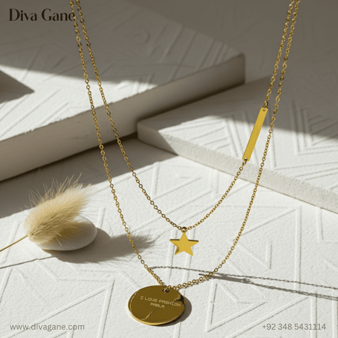 Shine bright with our Stellar Dreams Layered Necklace, a beautiful fusion of elegance and charm. This dainty gold-tone necklace features a double-layer design with a delicate star charm and an engraved round pendant that reads “I love fashion Paris,” adding a touch of European chic to your everyday style.