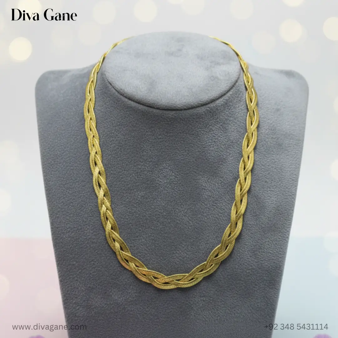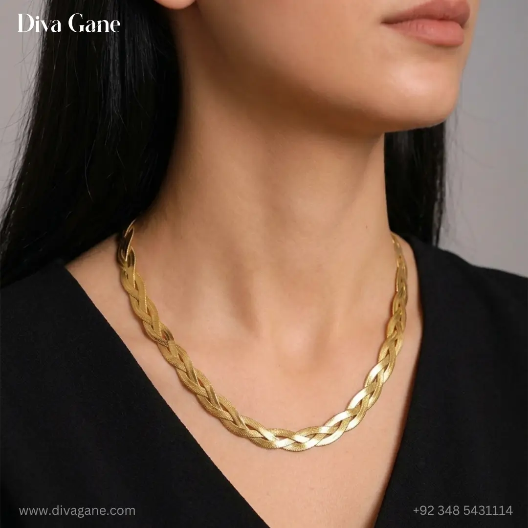Designed for the modern woman who appreciates architectural jewelry, this necklace combines the sleekness of a silk snake chain with the complexity of a braid. The polished gold-tone finish offers a warm, luxurious glow, while the adjustable extender chain allows you to customize the length from a tight choker to a relaxed collar necklace.